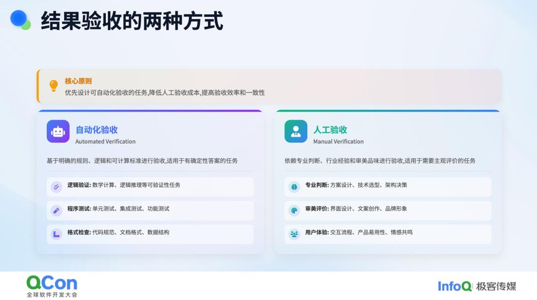 最后是验收环节,验收方式主要有两种:自动化验收和人工验收。我们尽可能实现自动化验收,但自动化验收需要逻辑清晰,例如编写和运行单元测试、编译或格式检查等,这些通常适用于明确的编程和数学场景。然而,人工验收有时是不可避免的。人工验收涉及多个方面,包括你在该行业的专业知识水平、审美能力以及对用户体验的感知能力等。这些都有一定的要求。因此,在验收层面,我们应尽可能实现自动化,同时通过人工验收来兜底。