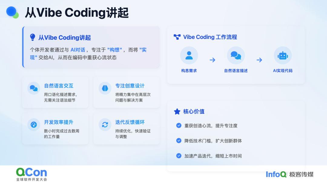 Vibe Coding 的概念其实无需过多解释。它主要是通过自然语言描述需求,然后让 AI Agent 来实现代码编写、测试并运行。在这个过程中,你无需过多关注代码的具体实现细节,只需不断提供反馈,指出“这里还不行”,并告知下一步该怎么做。最终,通过与 AI 的协作,完成整个软件的交付,这就是 Vibe Coding。这实际上是 AI 与工程师,乃至技术领导日常工作中频繁涉及的一项活动。