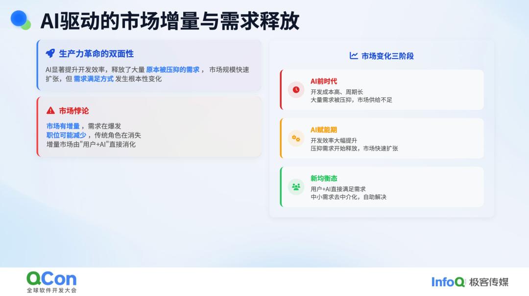 无论是 Vibe Coding 还是 Vibe Working,AI 对我们行业的冲击是显著且深远的。AI 的出现让整个市场进入了一个增量的过程。这种增量并非凭空产生,而是源于原本就存在的需求。过去,许多需求因为技术门槛过高而被压抑。例如,一些个人想要开发个性化的小工具,但由于不会编程,也没有足够的资金聘请开发者,这些需求一直未能得到满足。然而,AI 的出现打破了这一局面,它降低了技术门槛,使得这些被压抑的需求得以释放。