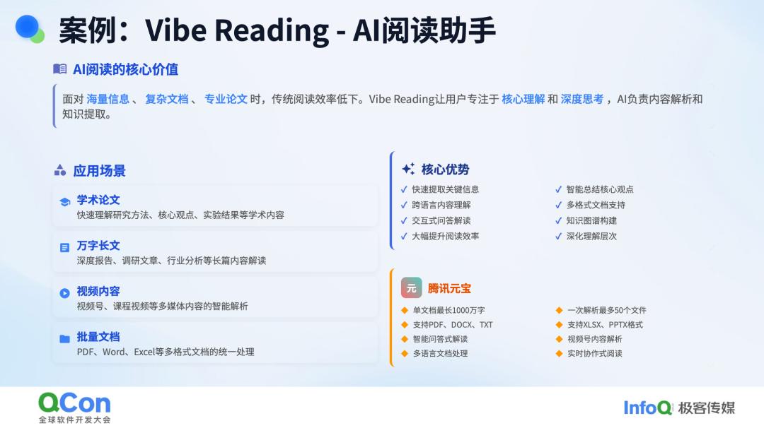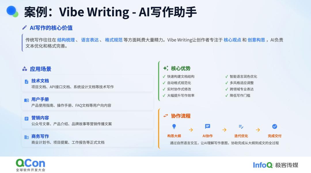 还有 Vibe Writing,也就是写作助手。现在大家看到的许多文档或公众号内容,基本上都是通过 AI 流水线式生成的。尤其是今年,AI 可以通过多 Agent 的方式拆分不同章节,让不同的子 Agent 分别撰写不同章节,这让撰写大型文档变得轻而易举,甚至撰写论文、专利等也不在话下。我自己也用这种方式撰写产品文档、说明书,甚至 API 接口文档也都是通过 AI 完成的。