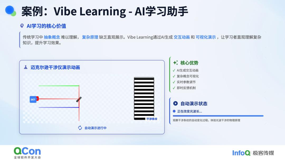 还有一个有趣的应用场景,那就是学习新概念。比如我们学习大型语言模型的工作原理时,如果有动画可视化展示其关键动作,我们会更直观地理解。AI 在这方面可以大显身手,比如它可以为我生成动画,展示光速的测量方法,或者迈克尔逊干涉仪中不同颜色光条纹的影响。在学习层面,这让我能够与 AI 进行非常强的互动,生动地演示我想要了解的知识点。对我来说,我已经不需要再去翻阅厚重的书籍,而是直接向 AI 提问,它会为我提供答案。