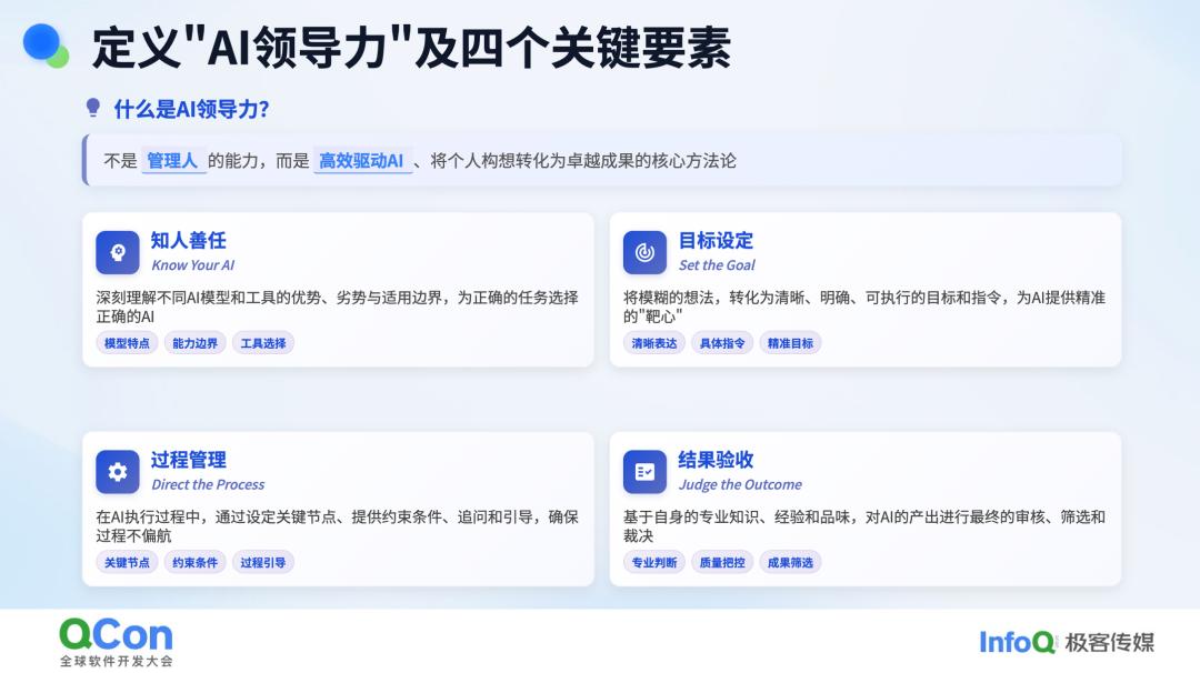 我们来定义一下 AI 领导力。刚刚我已经提到,我们需要设定目标、管理过程、验收结果。这其实也涉及到了“知人善任”的概念。不过,或许我们需要将其改为“知 AI 善任”。这四个关键要素可以概括为:设定目标、过程管理、结果验收以及知人(AI)善任。