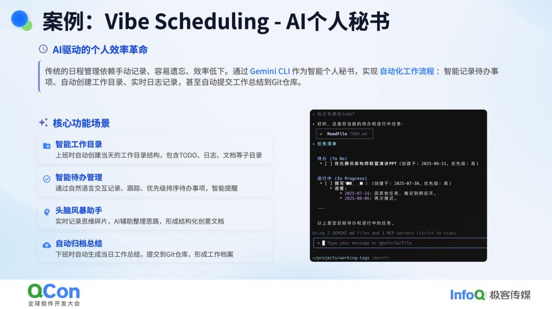 再比如个人秘书,我也进行了多次迭代。最早的版本是基于 Gemini CLI,它几乎是免费的,可以记录我的日常工作、安排日程等,所有这些都可以通过命令行与它对话完成。这与我们常用的结构化 Todo List 完全不同,Todo List 需要你自己去查看和记录,而这种秘书更像是真正的秘书,它会为你搭建一套数据存储系统,但你需要提示它进行结构化存储。现在,我已经升级到了第二版,加入了 Claude Code 和其他模型,功能更加强大。我还把它与我的企业微信打通,比如今天我要做演讲,它会提前几天提醒我准备,甚至处理各种出差事宜。它就像一个真正的秘书,只是它并非人类。AI 在我的工作和生活中,除了编程之外,还能在许多方面作为我能力的延伸,帮我完成许多不同的任务。