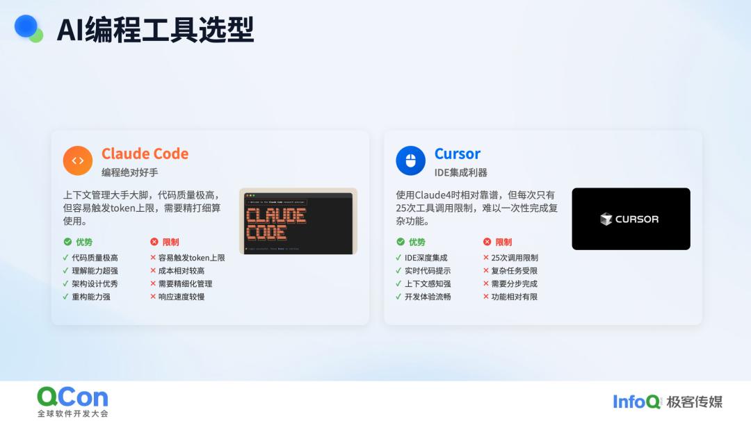 在 AI 编程工具的选型方面,目前 Claude Code 是我的首选。除了编程之外,我之前提到的个人秘书以及 PPT 制作等 Agent 工具,也都是基于 Claude Code 构建的。它的优点在于非常简洁,其 Agent 也很简单。它的特点是将对话中的所有内容都作为上下文传回,这种“大力出奇迹”的方式使得它在处理上下文时表现得比其他工具更出色。例如 Cursor 等其他 IDE 需要进行上下文压缩,而 Claude Code 则不需要。我们了解背后的逻辑,但也不会直接使用它的 API 付费方式,而是选择它的套餐,比如 Pro 版本。不过,使用 Pro 版本很容易触发 Token 的上限。即使你选择了 20 美元的套餐,现在又增加了周上限,很容易就触发了。
