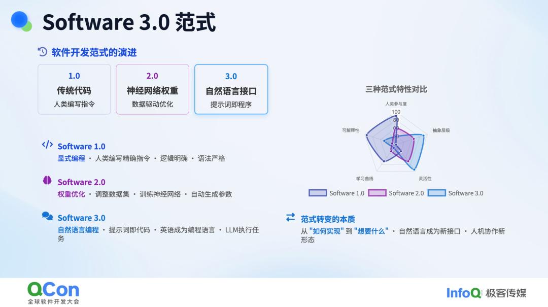 在谈到 Vibe Coding 时,我们也不得不提及 Software 3.0,因为当我们说要与 AI 共事时,这里的 AI 几乎指的都是 Agent。而 Agent 的本质是一种软件形式。无论是 Software 3.0 还是 Vibe Coding,都与 Karpathy 提出的概念有关,所以在这里一并提及。那么,1.0、2.0、3.0 这三种范式是如何演进的呢?