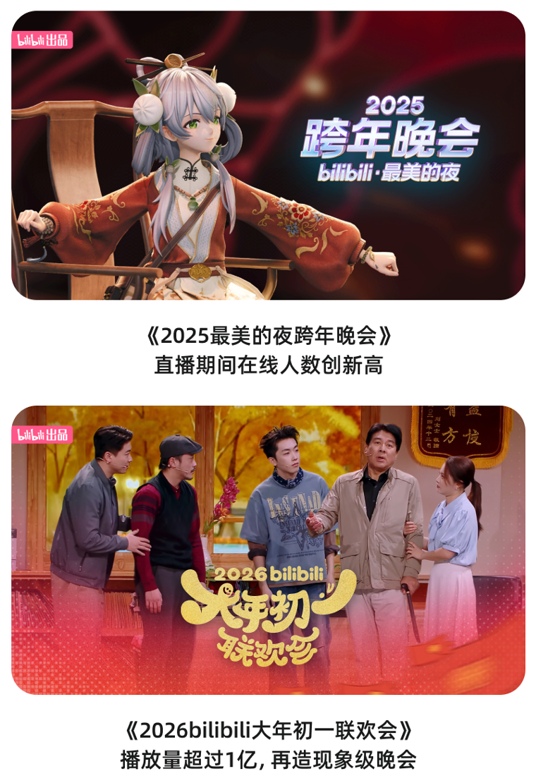此外,“最美的夜”跨年晚会和“大年初一联欢会”,直播间人气高涨,流量口碑双丰收,这背后是B站对自制精品内容的持续发力。