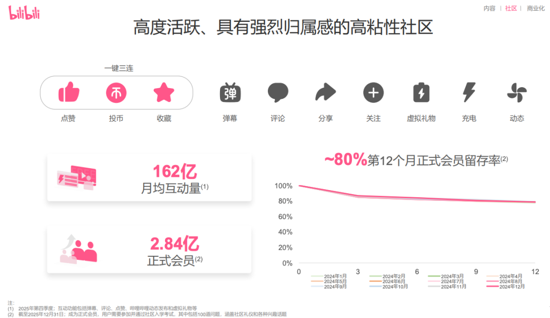 作为B站的传统优势品类,二次元和游戏内容在去年四季度继续保持向上态势,播放时长分别同比增长12%和24%。2025年,有超30家海内外厂商、40多款游戏在B站独家首发内容。