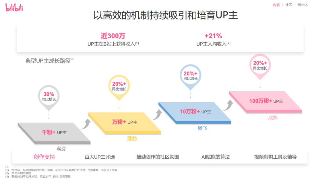 2025年第四季度,千粉以上的UP主数量同比增长了30%,标志着平台的腰部及头部创作者队伍正在迅速壮大。