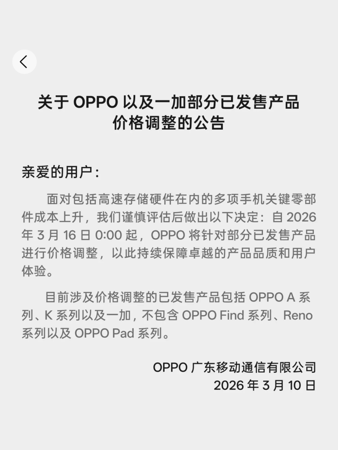 根据公告显示,包括 OPPO A 系列、K 系列已经一加手机在内的多个产品线,都将从 3 月 16 日开始正式调价。