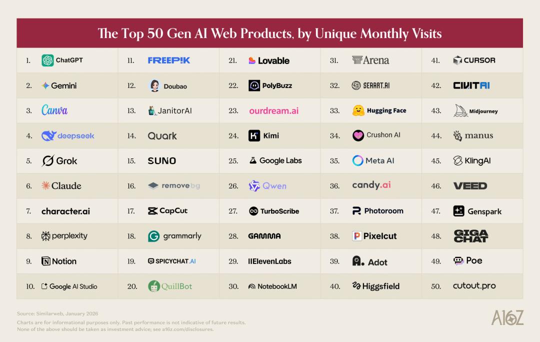 3 月 10 日,a16z 发布第 6 期全球 Top50 AI 产品榜单,与以往一样,本期榜单仍分 App 和 Web 端,分别参考 2026 年 1 月 Sensor Tower 的 MAU 数据和 Similarweb 的访问量数据。相比此前榜单,本期榜单最大的变化在于,a16z 调整了收录范围,因为深度集成 AI 功能且收入更多来自 AI 能力,本次报告将此前规避掉的 CapCut、Canva、Notion 等融入了 AI 功能的老产品纳入了榜单。