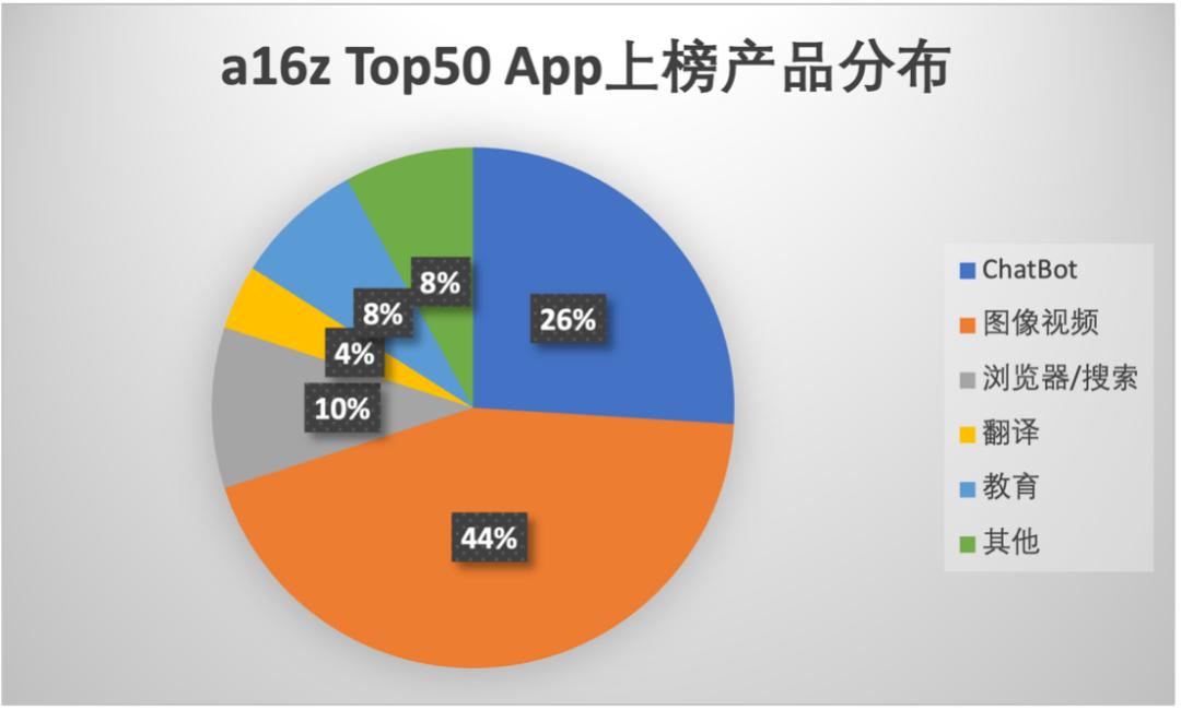 从 App 端的情况来看,图像视频品类上榜的产品数量达到 22 个,占了整个榜单的 44%;ChatBot(包括助手和陪伴)一共 13 款,占比 26%。