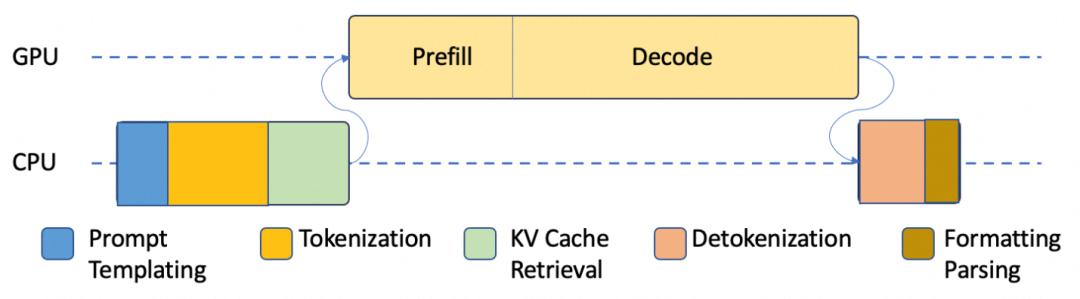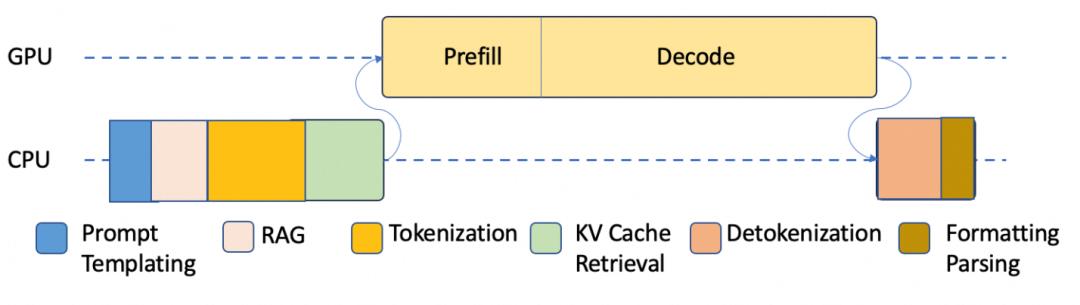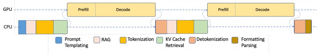 在这样一套“思考-行动-感知”流程中,CPU与GPU的交互如下图所示。CPU更加积极的参与到模型的决策链条中,承担起不适合GPU操作的向量数据库查询操作。智能体RAG只是智能体应用的一个例子;可以想象,在一个更为通用的智能体应用设定中,RAG可能被替代为代码编译,Web搜索,Python解析和执行等等。CPU成了智能体与环境交互的一个关键渠道。