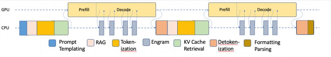 除了对模型本身推理能力的提升以外,Engram对推理硬件的架构也带来了深远的影响。Engram 的特性允许它将庞大的静态知识表存放在主机内存中,而在 GPU 执行推理时异步预取(比如,GPU推理第5层时,CPU开始查找第12层所需的信息,CPU查找延时几乎被GPU 5-12层推理延时完全隐藏)。这意味着我们可以给 Agent 挂载一个上百GB 甚至更大 的知识库,却几乎不占用昂贵的 GPU 显存,也不显著增加延迟。这为AI智能体的普及提供了一条极具成本效益的路径。在有了Engram之后, CPU-GPU之间的交互模式如下图所示。 和之前的交互模式的一个显著区别是,CPU在GPU做推理的过程不再闲置而是参与其中:CPU不再局限于预处理和后处理, 其整体的利用率显著提升。