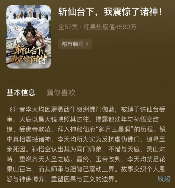 这一类型是当前市场最受瞩目、技术含量最高的类型。制作深度依赖AI工具实现全流程生成,涵盖分镜、绘图、动画、配音、剪辑等环节。主要题材以2D/3D动画为主,画面精细度较高,擅长表现玄幻、奇幻等超现实题材,受众群体覆盖广。例如,全网第一部单平台10亿播放量的爆款AI漫剧《斩仙台下,我震惊了诸神!》就是这一类型。该剧自2025年10月17日同步上线红果、快手,再加上全平台盗版搬运,保守估计全网播放量在20亿以上。