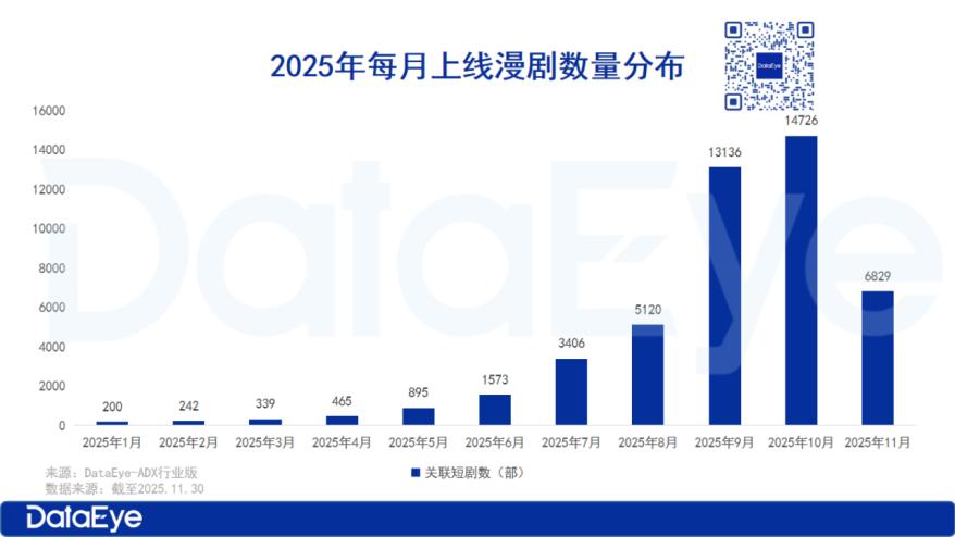 根据DataEye-ADX行业版数据显示,自2025年1月起,抖音平台漫剧上线数量持续增长,9月和10月的漫剧上线量占全年在播漫剧总数的59.37%,创下年度峰值。在2025年11月专项治理通知实施后,11月上线数量大幅回落,其主要原因在于平台新的审核标准落地。