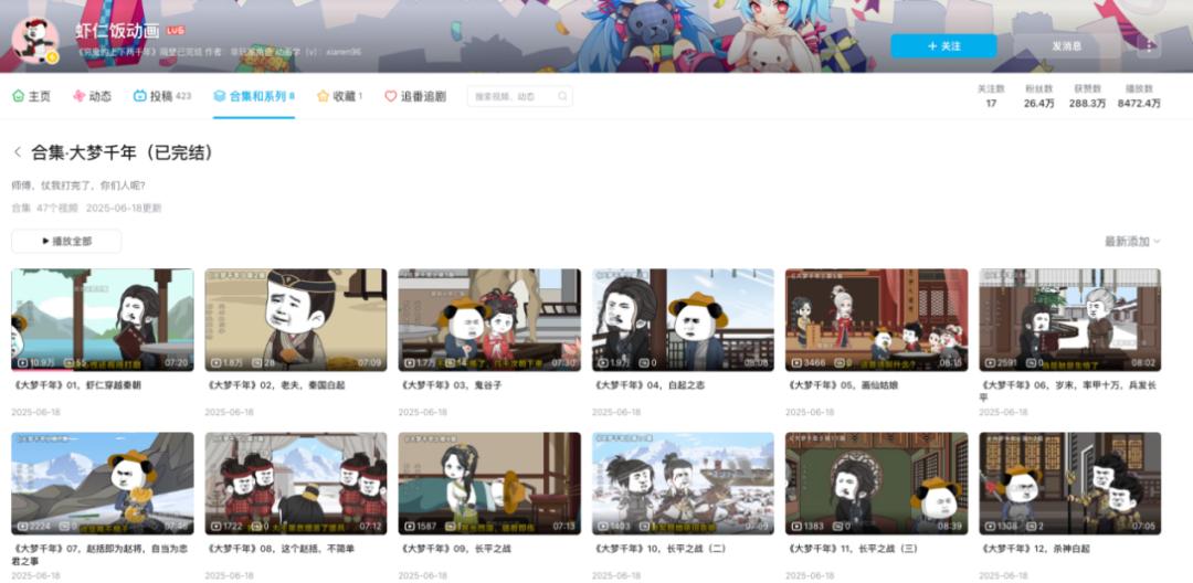 这类漫剧相较于其他类型入门非常简单,本质上是“人物素材”和“场景素材”的组合再搭配声音。素材来源包括购买素材包、网上寻找免费资源或自行制作。这类内容虽然画面较为简单,但仍有广泛受众。截至2025年8月,抖音端漫剧付费自然流已达1000万+/天。比如,由作者“虾仁饭”创作的《大梦千年》,该剧改编自起点网文《穷鬼的上下两千年》,自上线后就获得了上亿点击量。