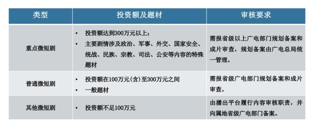 “分类分层审核”是指根据投资额度、题材等标准,将微短剧划分为“重点微短剧”“普通微短剧”和“其他微短剧”三类,实施差异化审核。而根据国家广电总局近日印发的《关于调整微短剧分类分层标准的通知》,自2026年1月1日起,级别分类及审核要求如下:
