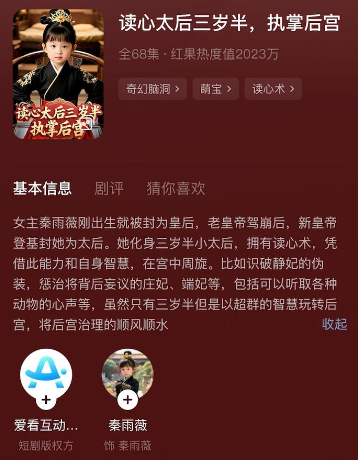 此类漫剧通常改编自热门网络文学IP或原创短篇剧本,通过强化剧情冲突和“即时爽感”吸引用户,全部视听画面为通过AI技术生成具有真人风格视觉效果的角色和场景,其视觉风格融合漫画元素(如对话框、夸张表情)与真人动画的细腻表现,以适应短视频平台的碎片化消费习惯,比如此前爱看互动短剧出品的仿真人漫剧《读心太后三岁半,执掌后宫》就是这一类型。相较于其他类型,仿真人漫剧制作成本和难度均较高。