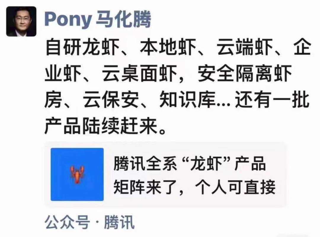 为了大力宣传自家的“龙虾”产品矩阵,马化腾还特意在朋友圈转发了相关推文,并表示“自研龙虾、本地虾、云端虾、企业虾、云桌面虾,安全隔离虾房、云保安、知识库......还有一批产品陆续赶来。”