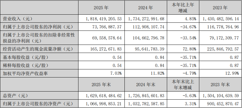 3月10日,朝阳科技正式发布2025年年度报告。报告显示,公司在复杂的外部环境和激烈的行业竞争中,继续保持稳健经营态势,全年实现营业收入18.18亿元,同比增长4.85%;归属于上市公司股东的净利润为7376.69万元,同比下降34.67%。