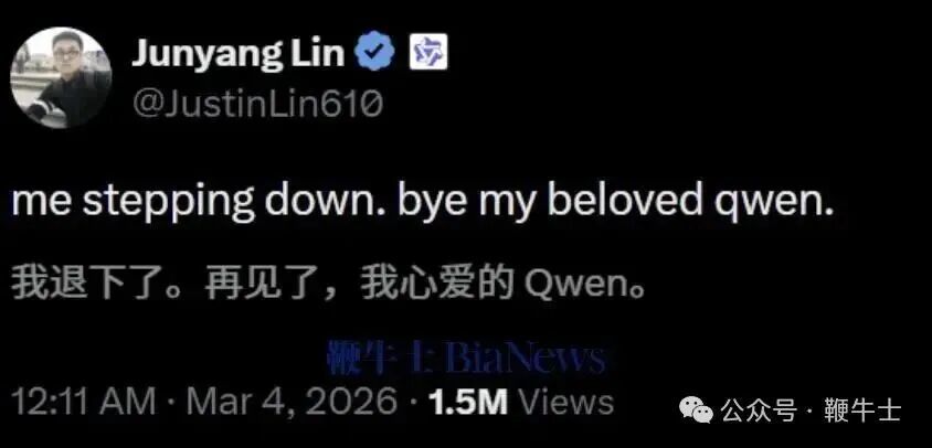 林俊旸表示,“me stepping down. bye my beloved qwen.(我卸任了。再见了,我亲爱的千问。)”