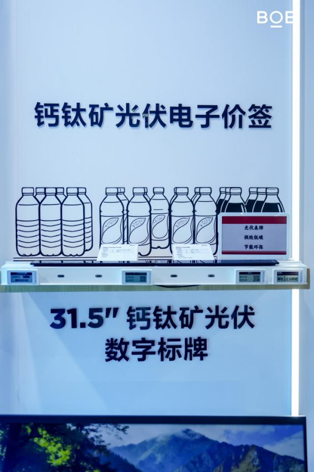 作为可持续发展战略的长期践行者,本次展会中,BOE(京东方)带来了多款创新的钙钛矿光伏技术及系列产品。钙钛矿光伏柔性大组件凭借出色的柔韧性,具备优异的抗冲击性能,有效降低隐裂与破损风险。同时,依托其弱光发电效率高、轻质化、可半透明以及尺寸可定制等技术优势,可广泛应用于消费电子、CIPV(汽车光伏一体化)、BIPV(建筑光伏一体化)、电站等多元场景。目前,该技术已在本次展出的光伏价签、电子桌牌、31.5寸数字标牌及光伏电动车等产品中实现应用。