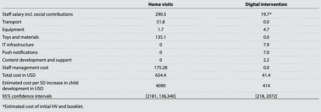 而数字干预在同样的周期下,每个孩子的平均成本仅为 41.4 美元,成本为传统家访的 1/15。除此之外,每提升 1 个标准差发育水平家访模式需要花费 4090美元,而数字干预仅需花费 414 美元。