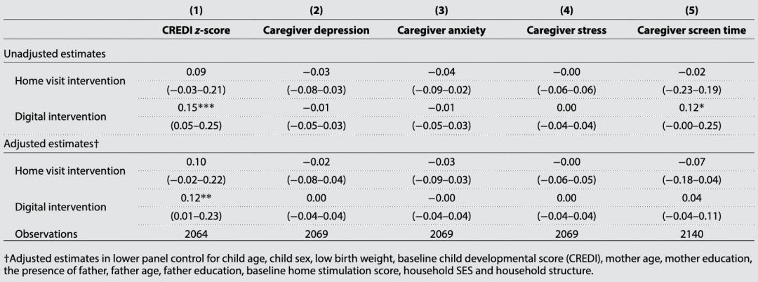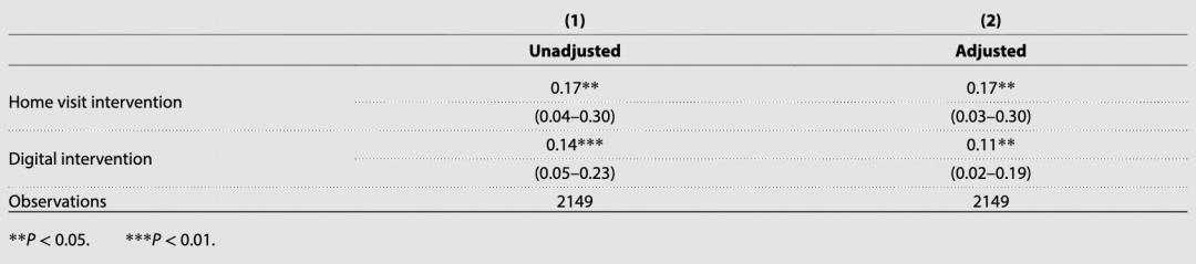 结果令人振奋:家访组的儿童发育水平提升了 0.17 个标准差;数字干预组的儿童发育水平提升了 0.11 个标准差。