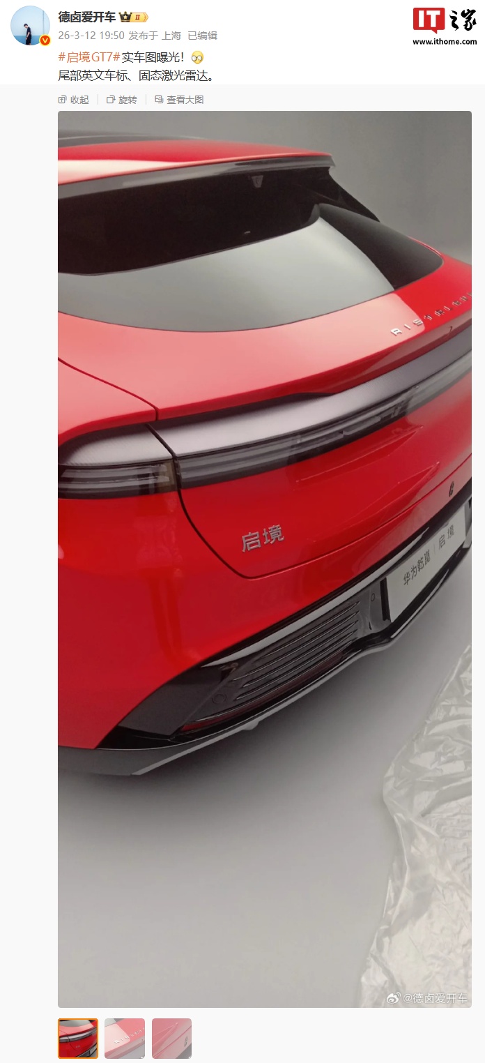 IT之家 3 月 12 日消息,博主 @德卤爱开车 今日分享了华为乾崑 | 启境 GT7 实车的局部图,画面展示了新车的尾部英文车标和固态激光雷达。