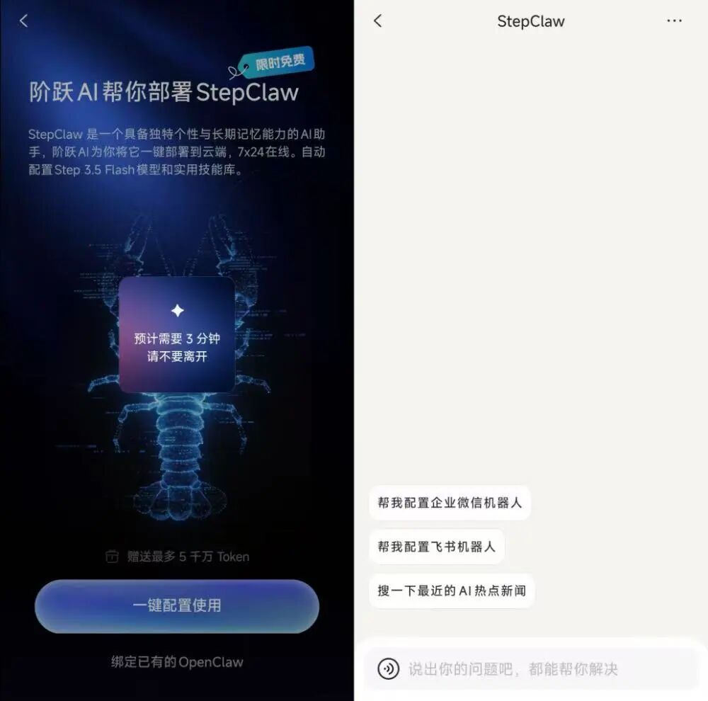 StepClaw一键配置界面(左)与StepClaw聊天界面(右)