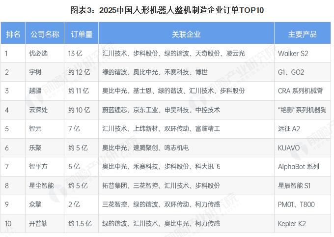 从人形机器人整机制造企业获得的订单规模来看,截至2025年11月,优必选以高达13亿的订单量位居行业榜首,主推产品为Walker S2;宇树以约12亿的订单量紧随其后;越疆则凭借CRA系列工业协作机械臂,成为工业场景人机协作的主力机型,订单量约11亿元,位居行业第三。