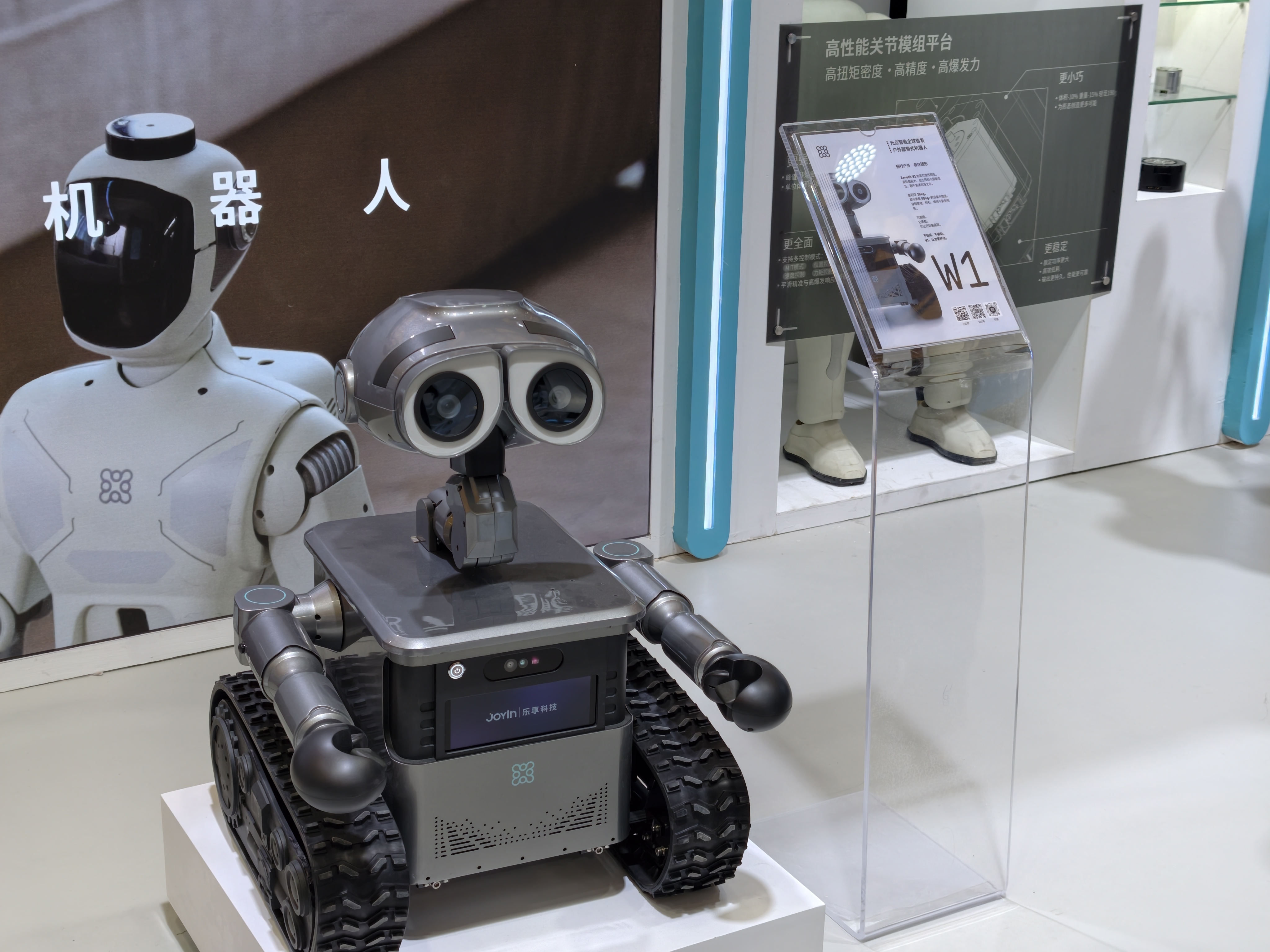 同样主打场景覆盖的还有元点智能,不仅有全尺寸人形机器人 Jupiter,还展示了两款更贴近家庭场景的机器人:陪伴机器人 M1 以及户外履带式机器人 W1。尤其是户外履带式机器人 W1 在外观上比较接近「瓦力」,对于很多人都颇具吸引力,功能上基本对齐了家用机器狗,能负载、能跟随,特别在于采用履带而非四足设计。