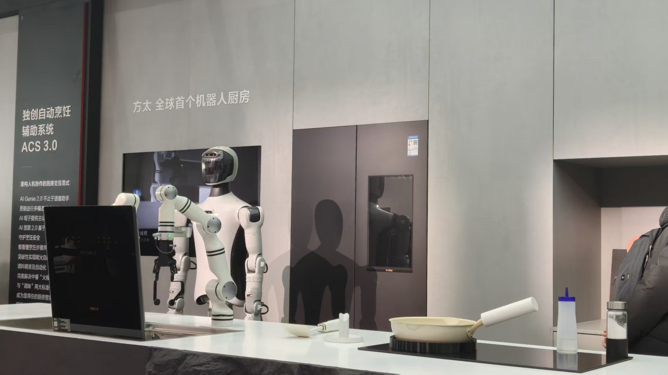 在 AWE 2026 上,方太展示了一套「成长型厨房具身智能系统」,核心是一台人形机器人以及多台机械臂,与厨房电器协同完成烹饪流程。现场演示的流程大致是: