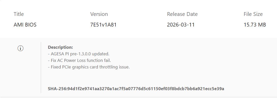 首批获得更新的型号为微星 MAG X870 Tomahawk WiFi,新 BIOS 版本号为 7E51v1A81,其核心内容是引入了 AMD AGESA PI Pre-13.0.0 微代码。该版本专门优化了 PCIe 模式锁定逻辑,防止显卡在启动阶段被错误限制在低带宽状态。
