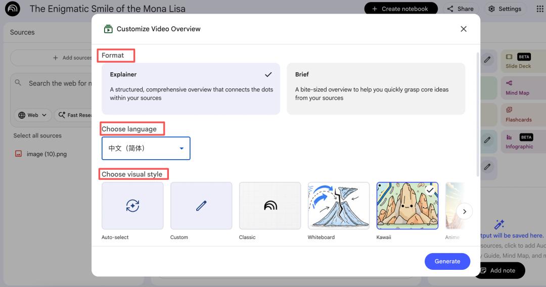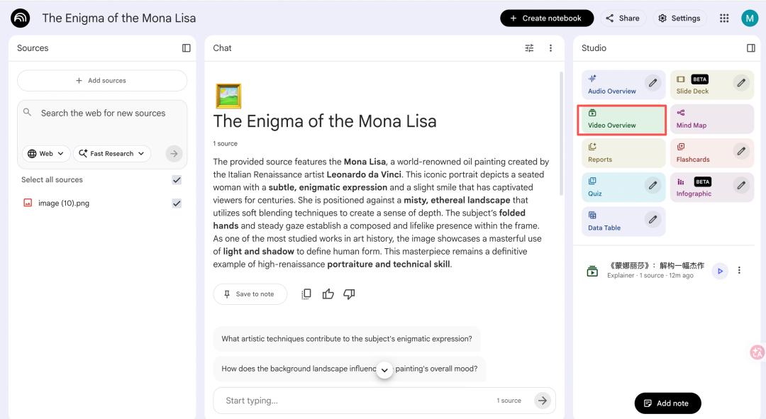 我们也上手试了下,上传一张蒙娜丽莎的图片后,系统会自动生成一段作品介绍,点击右侧栏的「Video Overview」, AI 便开始读取文本、提取关键信息、构建可视化画面并添加旁白。