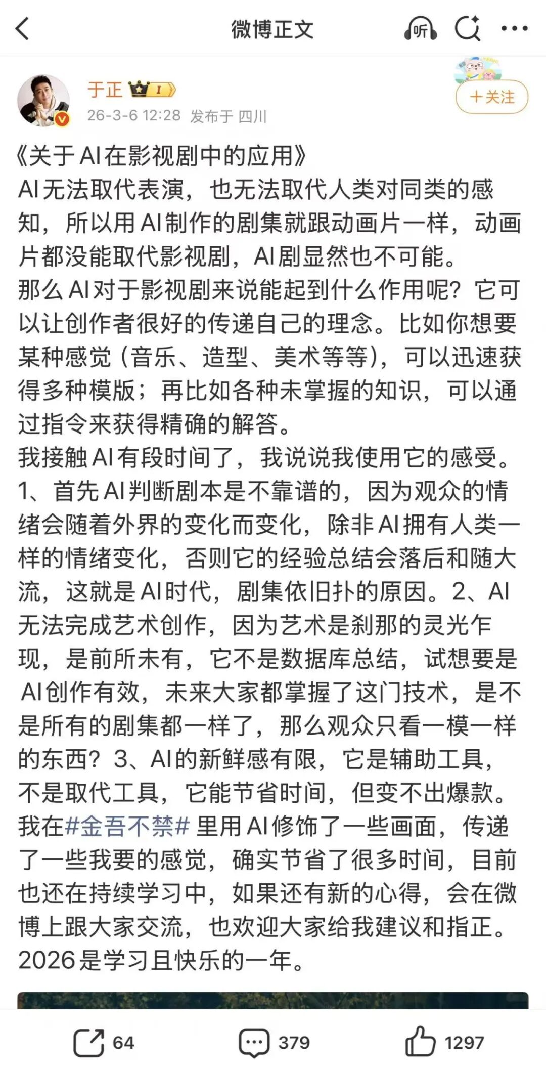 所谓“行业变天”,变的或许只是行业节奏,而不是创作主体。AI会越来越强,但影视行业最核心,依旧会是真人的创作力和生命力。