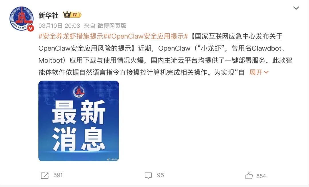 3 月 10 日晚,CNCERT 正式发布《关于 OpenClaw 安全应用的风险提示》。话说得已经很直白了:这东西权限高、配置松、插件生态还很野,普通用户别拿主力设备裸奔。