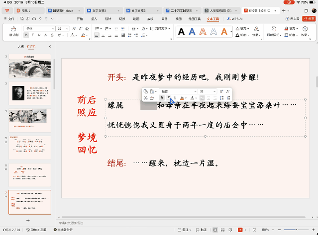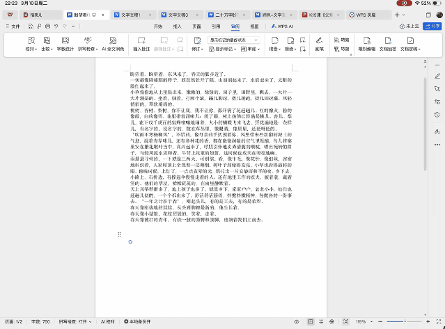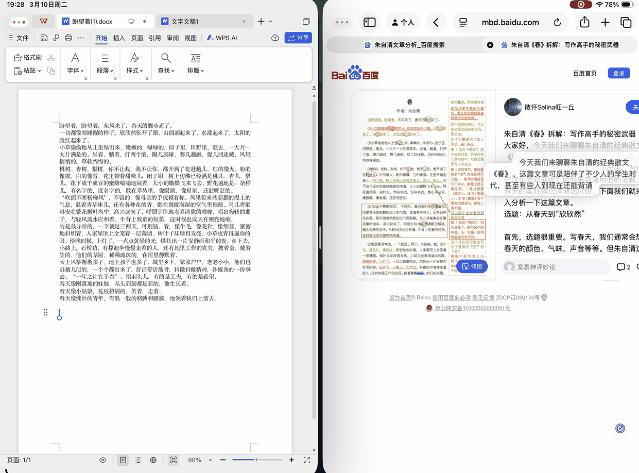 比如小编让 WPS 灵犀智能体帮我写一份朱自清散文《春》的教学课件,我只需对灵犀智能体说一句简单的指令,它就能帮我从 PPT 思路到文稿到大纲到成品,一口气完全做出来,并且整体效果很不错,整个过程只用了几分钟,比自己从头开始做快上数十倍。而小编只需要在此基础上修改就行了。在 iPad 上能够轻松完成这样的工作,放在过去确实是很难办到的。