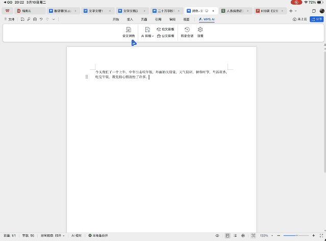 最令人欣喜的是 WPS for Pad 完整内置了 WPS AI 3.0。实测中,小编可通过 WPS AI 直接完成文案润色、格式排版等操作,无需手动切换功能菜单。
