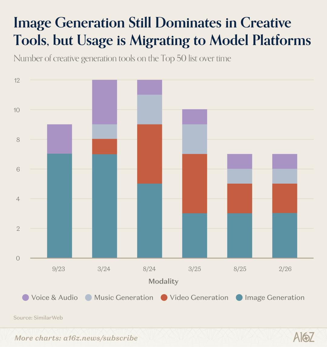 但a16z的结论是:图像生成正在从独立产品,退回成平台默认功能。