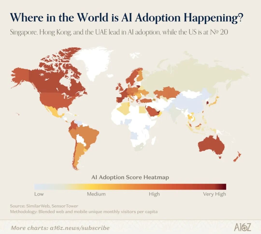 就在国内人人都在为AI焦虑、担心自己会不会掉队的时候,a16z做了一个人均AI使用指数,得出了一个很意外的结果: