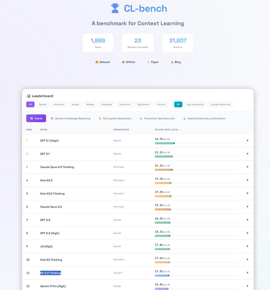 2026 年 2 月腾讯混元与复旦大学联合发布了专门评估大语言模型上下文学习能力的基准测试 CL-Bench。但就是这个由腾讯参与设计的测试,腾讯自己最新的大模型混元 2.0 Thinking 仅获得 17.2% 的得分位列榜单第 11 位,不仅显著低于 GPT 5.1 等国外明星产品,也弱于 Kimi K2.5。测试中,混元 2.0 Thinking 虽然比 Qwen 3.0 和豆包 1.8 更强,但阿里与字节的最新版本 Qwen 3.5 与豆包 2.0 并未参与测试