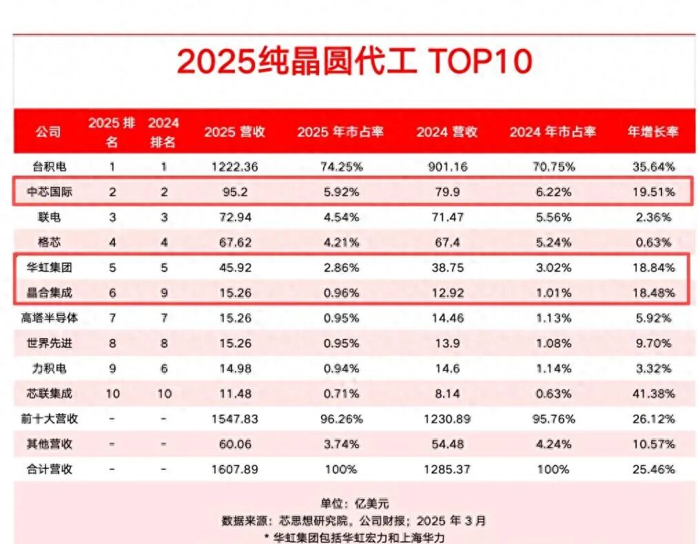从市场份来看,2024年这三大代工厂占据了超过10%的市场份额,而2025年市场份额下降到了9.74%,市场份额还略微有所下降,与台积电差距依然很大。