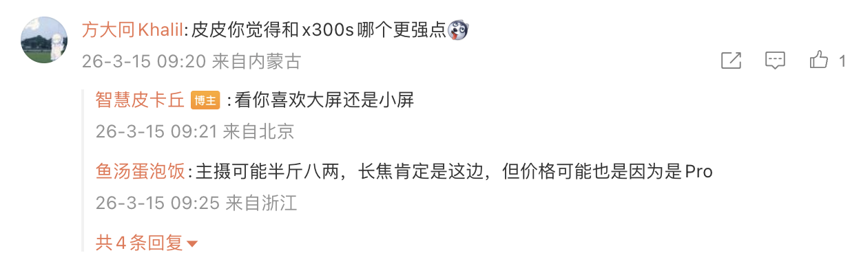 后续有用户在评论区询问:“皮皮你觉得和 x300s 哪个更强点”,博主回复道:“看你喜欢大屏还是小屏”;另一名用户则询问道:“扬声器接口马达什么的不会还是最基础那一档吧