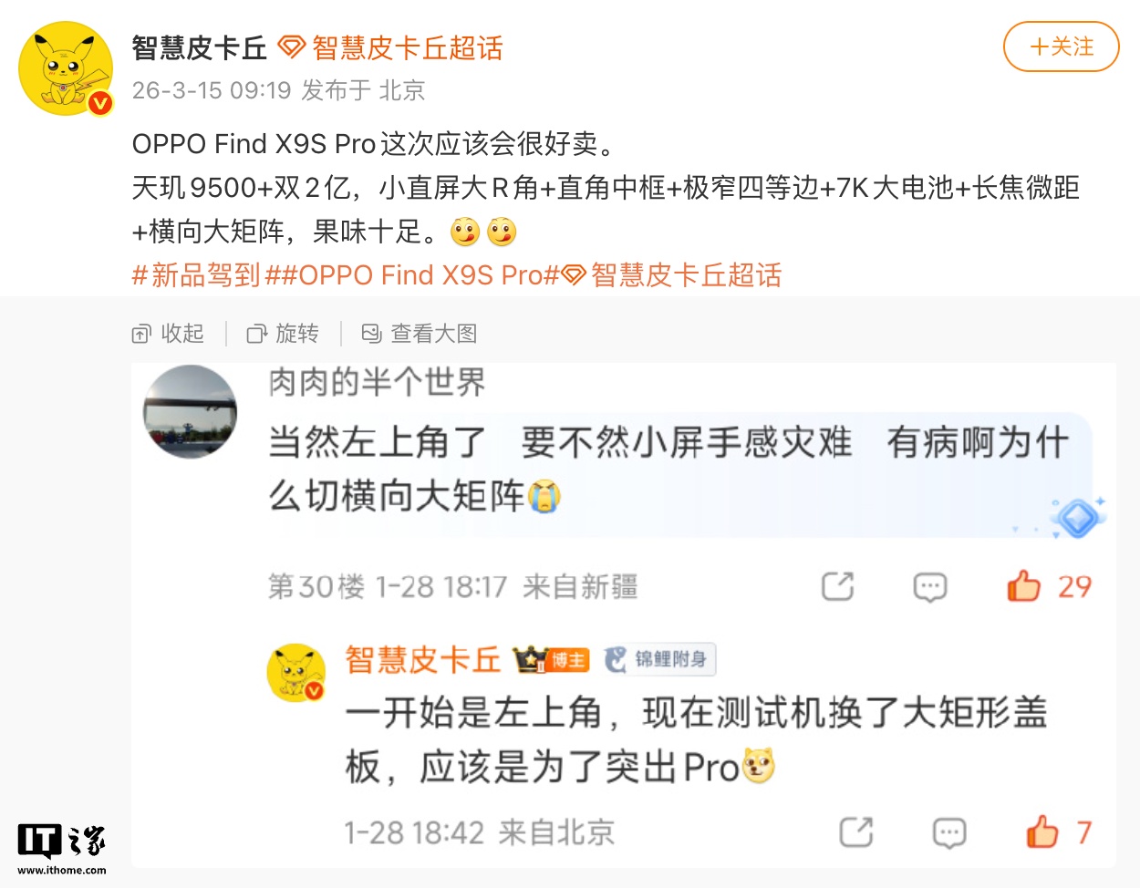 IT之家 3 月 15 日消息,博主 @智慧皮卡丘 今天在微博透露 OPPO Find X9s Pro 手机的详细参数。