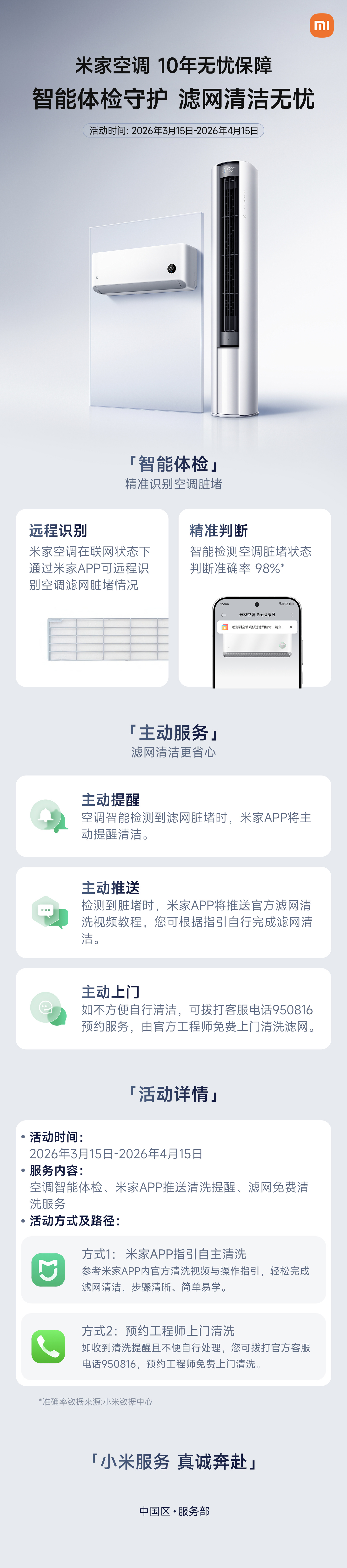 此次上线的智能体检功能,是米家空调在售后服务方面的又一举措。IT之家注意到,米家空调去年 9 月曾推出 10 年免费包修服务。根据规则,凡在 2025 年 1 月 1 日起完成首次安装的米家空调,均可升级享受 10 年免费包修。该项服务涵盖整机包修,包括上门、人工、检测、更换配件、加氟等环节均免费。