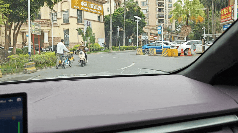 最让电车通意外的是它在小路的表现。试驾路段有一段是学校周边的便民小路,只有双向单车道,路边还停着不少私家车和货车,偶尔还有行人、电动车穿梭。以前试过的不少智驾,一到这种环境就容易「犯懵」,要么犹豫不前,要么识别不准路边的障碍物,频繁提示需要手动接管,开起来特别累。
