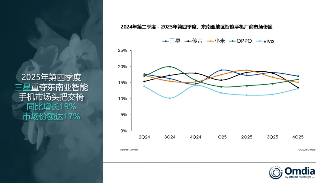 Omdia研究显示,2025年, 东南亚智能手机出货量达到1亿部,同比下降1%,主要因前三季度表现疲软拖累了整体市场。然而,该地区在2025年第四季度恢复增长,出货量同比上升2%至2,580万部,结束连续三个季度的下滑趋势,并展示出年底市场动能有所改善。