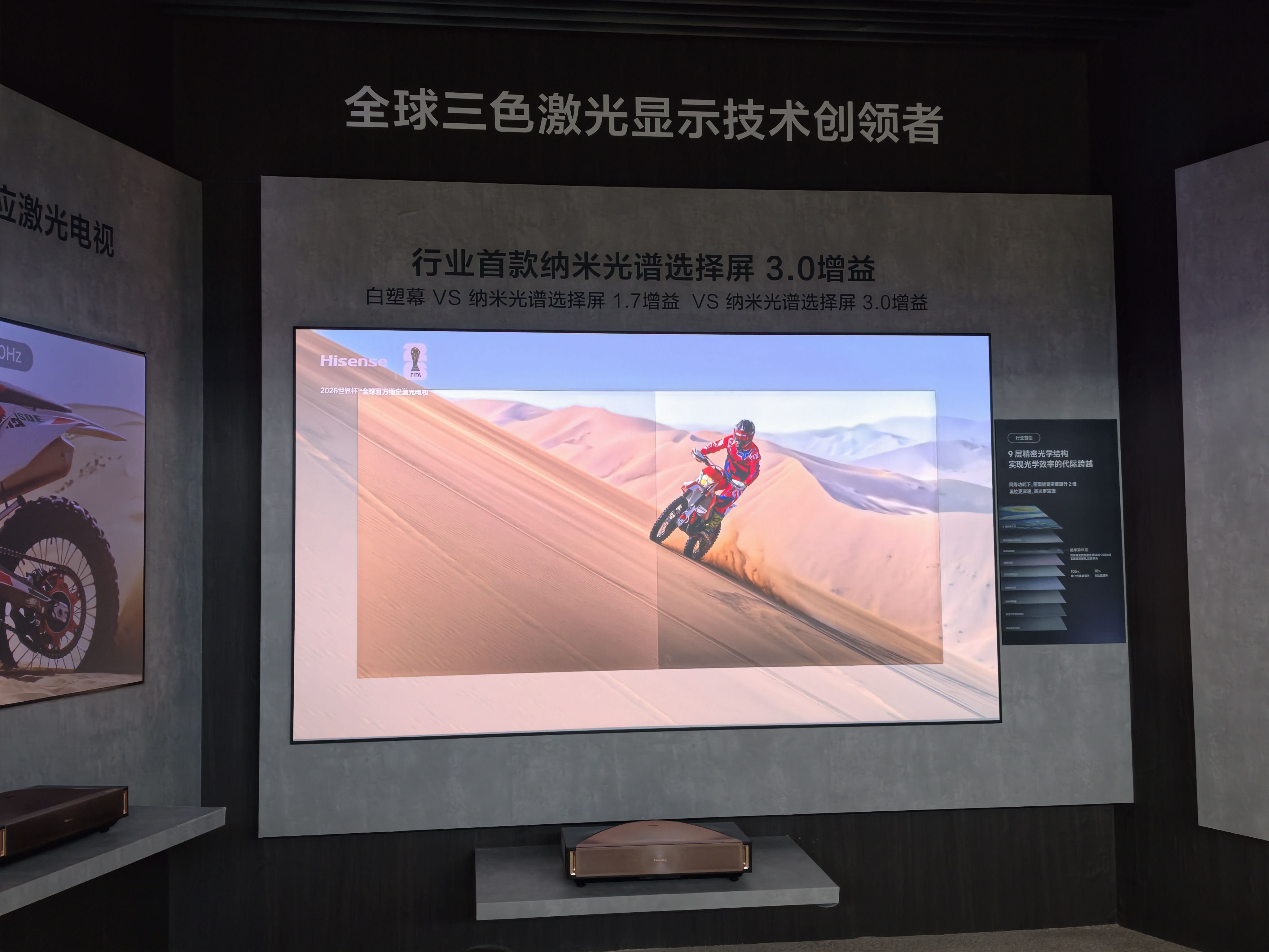 海信带来的新款激光电视,则搭载电影院同源、且比IMAX影院还要宽10度的「DLP数字影院放映技术」,搭配海信首创的「光谱选择屏」,可有效抗环境光,0屏幕辐射/眩光/反光/频闪。