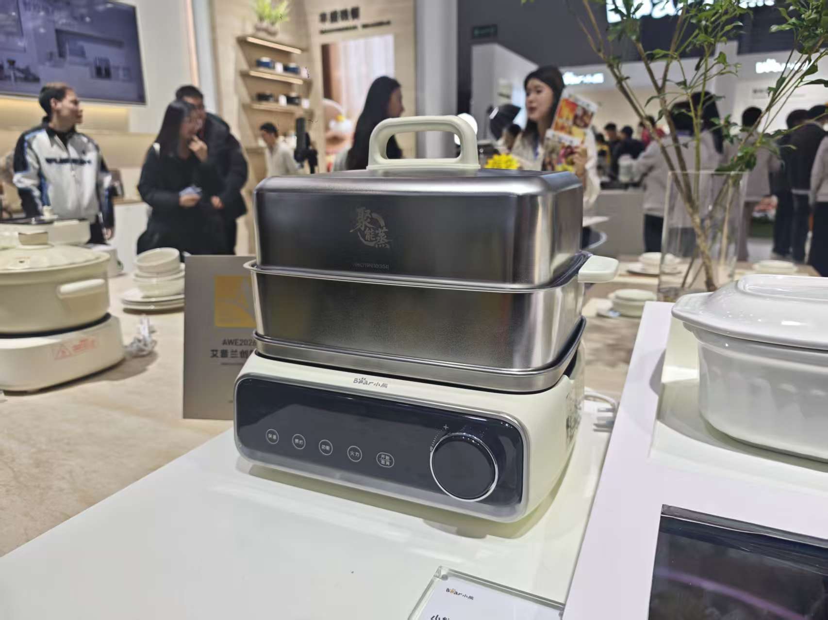 四是只要能匹配用户群体需求,哪怕是电蒸锅等小家电,都会有创新空间。比如在小熊展台,雷科技就看到了一款聚能蒸电蒸锅,其最高可以叠到三层,搭配上官方附赠的一些小碗、炖盅之类的,号称一台就能替代「蒸锅+电煮锅+电炖锅+电火锅+饭煲+高温洁净机+BB煲+早餐机」,吸引了很多用户驻足体验。